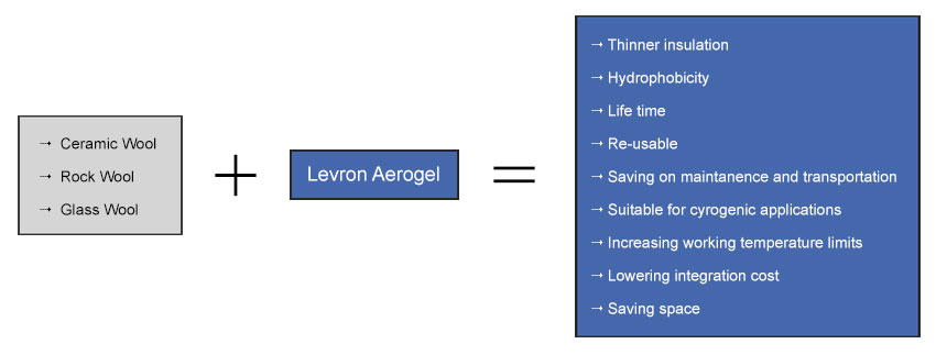 When Levron Aerogel is used as an additive in conventional products such as rock wool, glass wool or ceramic wool, adds features like resistance to humidity and water, improved heat insulation, incombustibility, and longevity.